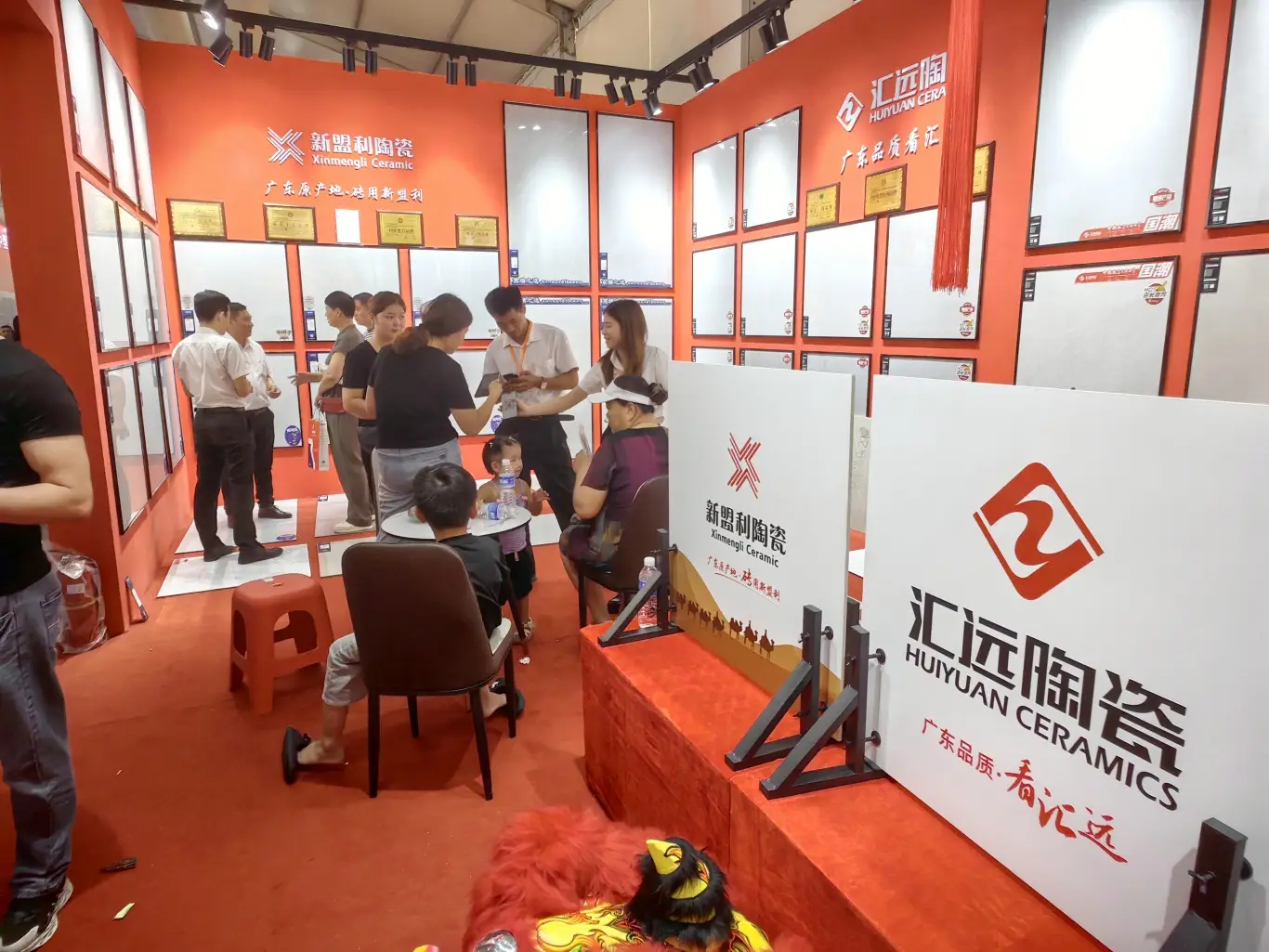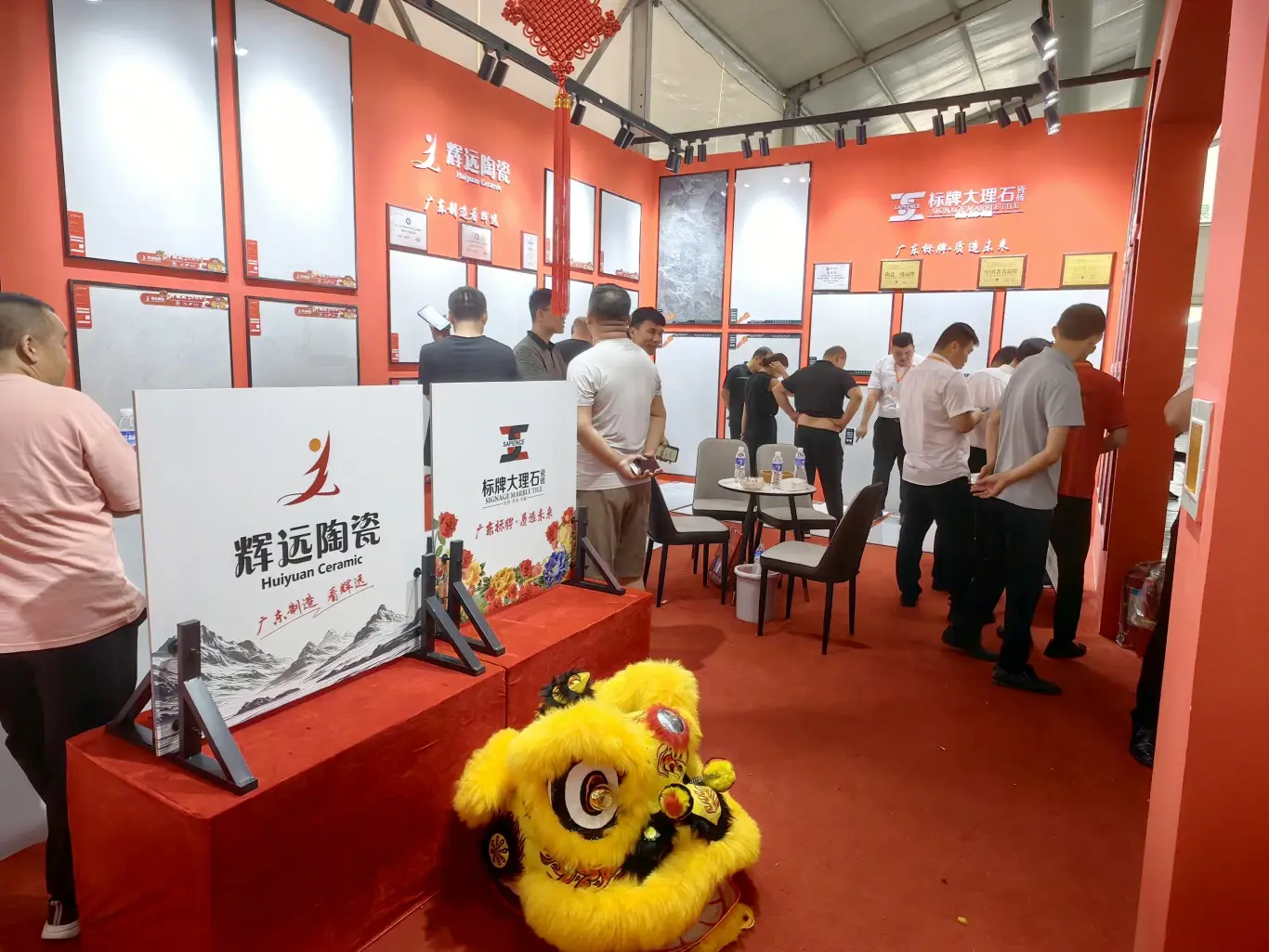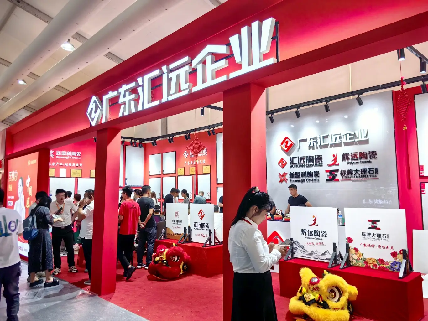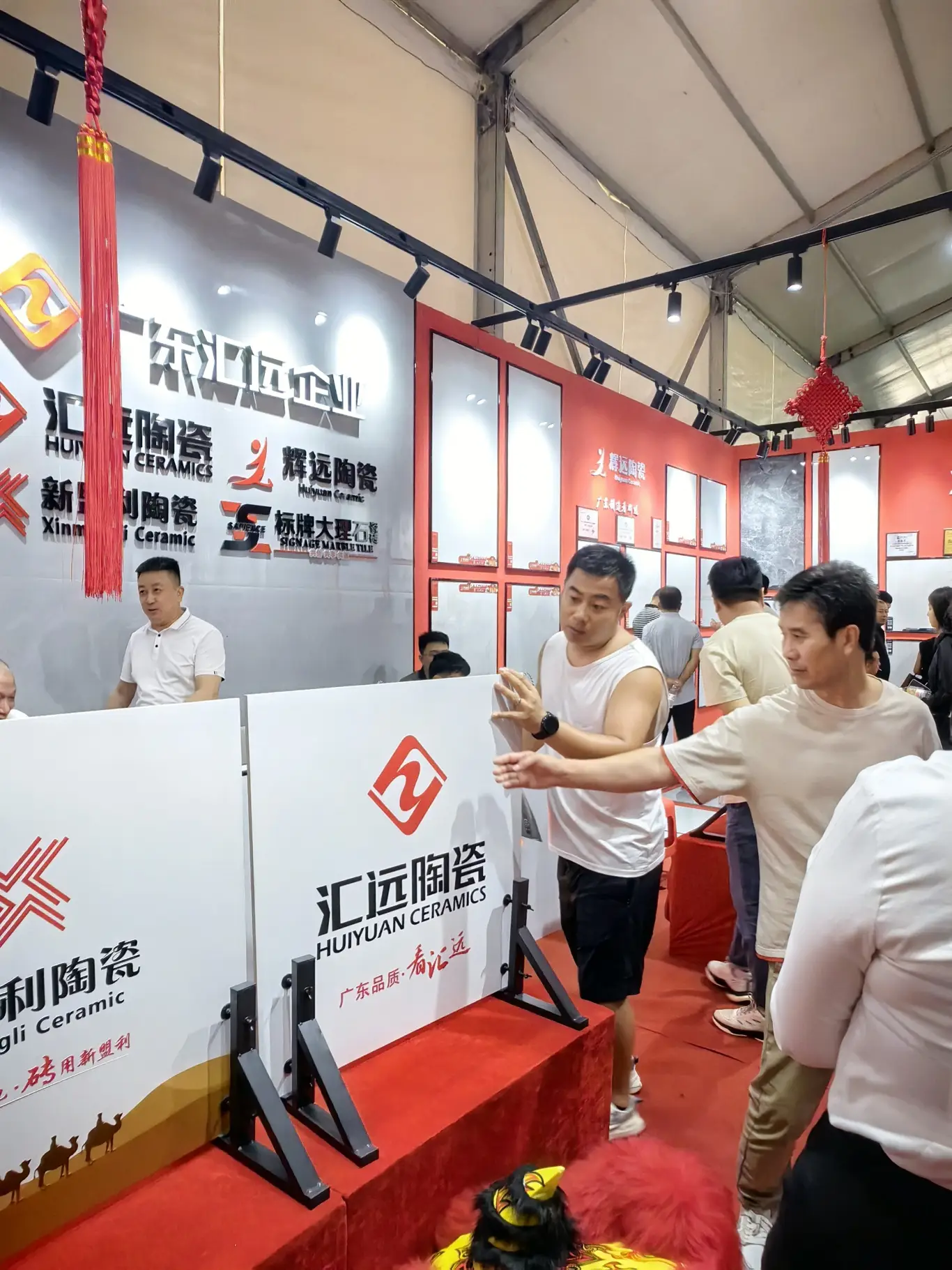 展会为期三天,汇远企业每天都是展会中最吸睛的展位。我们的展位以中国红为设计主色调,融入了中国风,佛山陶瓷,舞狮等多种岭南特色文化元素,同时为了现场突出品牌的独特性,还特意用800*800至尊白的新产品进行雕刻工艺,更大程度展示各自品牌文化,辉远品牌—昆仑山脉,新盟利—丝绸之路,标牌——繁花似锦等等。
