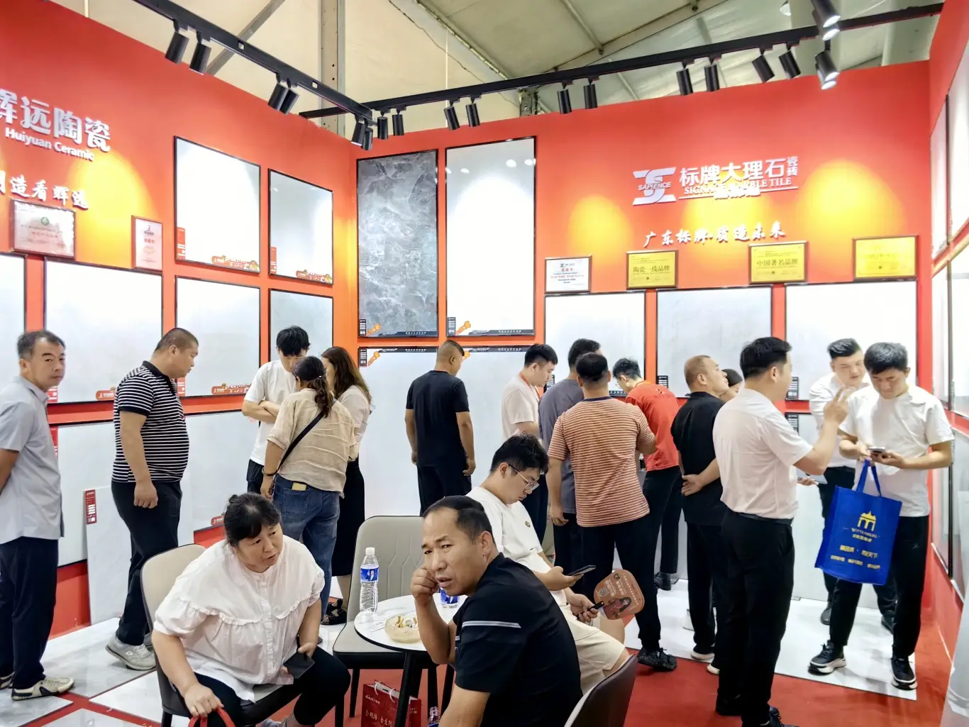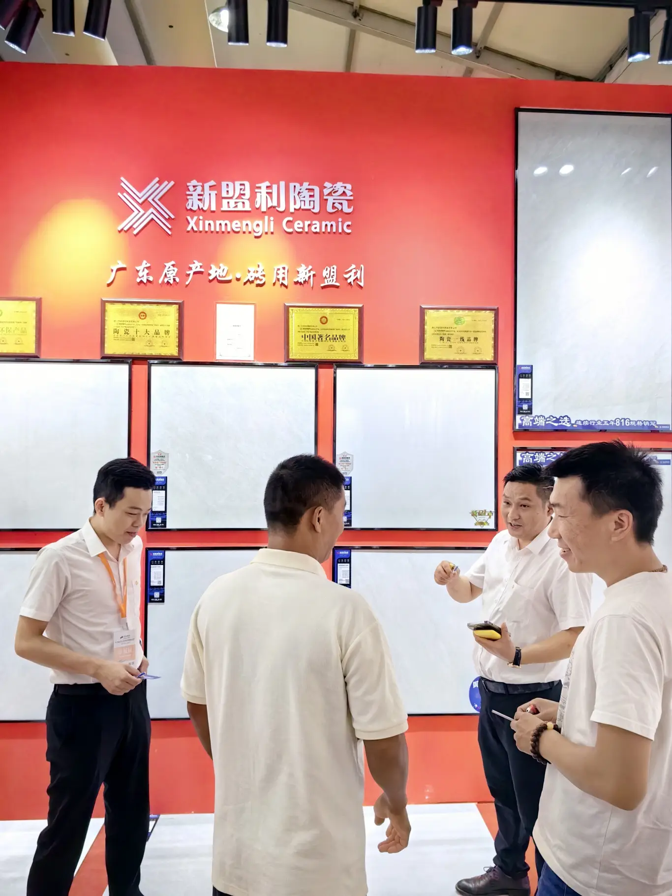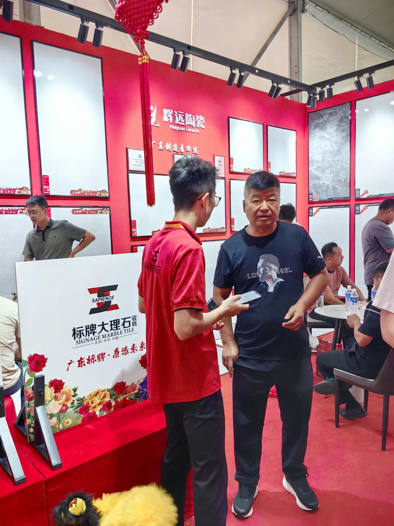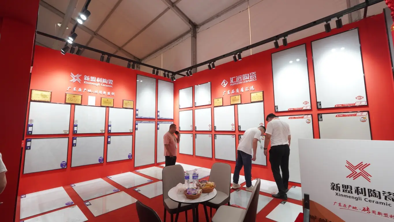 展会为期三天,汇远企业每天都是展会中最吸睛的展位。我们的展位以中国红为设计主色调,融入了中国风,佛山陶瓷,舞狮等多种岭南特色文化元素,同时为了现场突出品牌的独特性,还特意用800*800至尊白的新产品进行雕刻工艺,更大程度展示各自品牌文化,辉远品牌—昆仑山脉,新盟利—丝绸之路,标牌——繁花似锦等等。