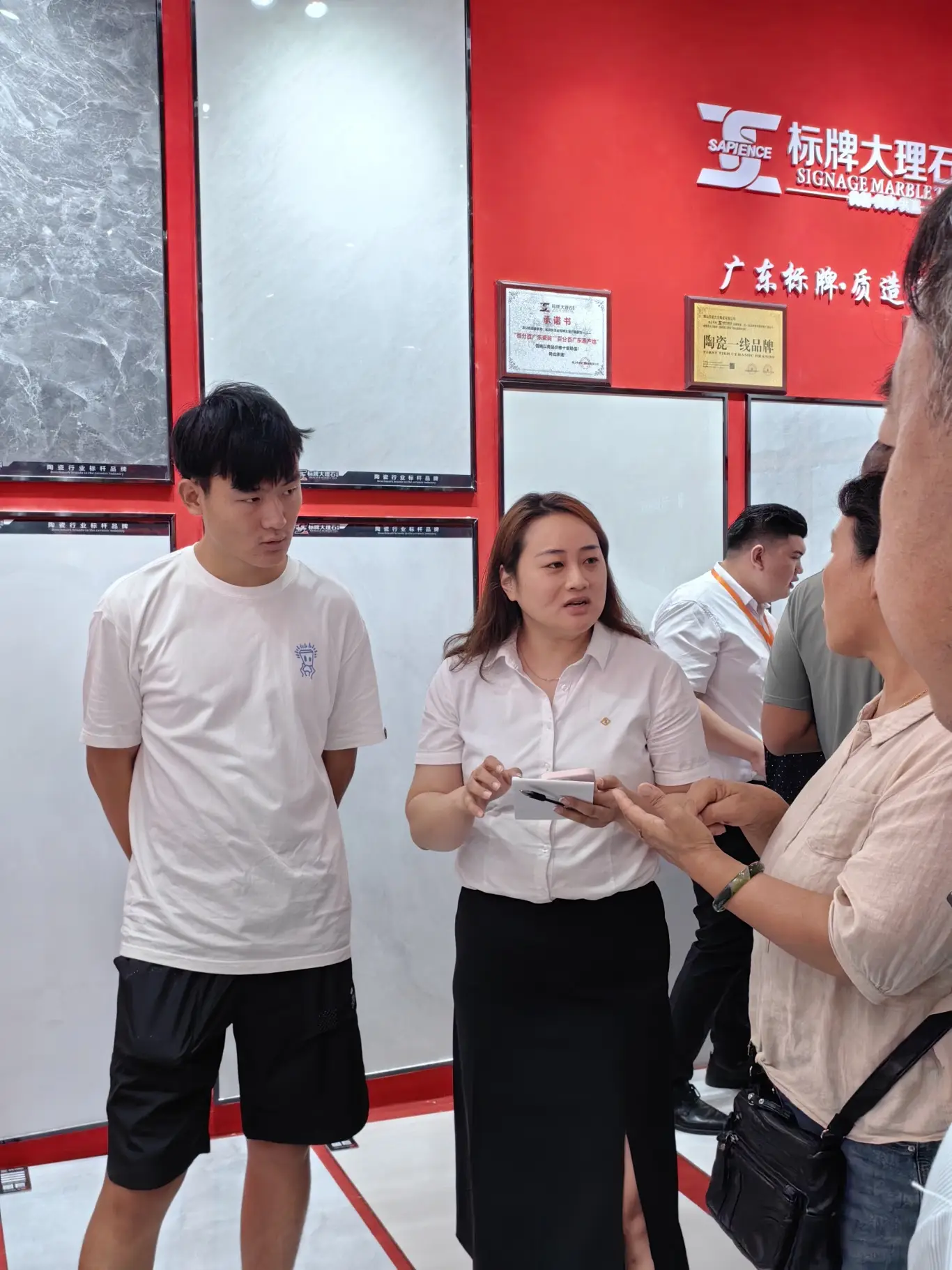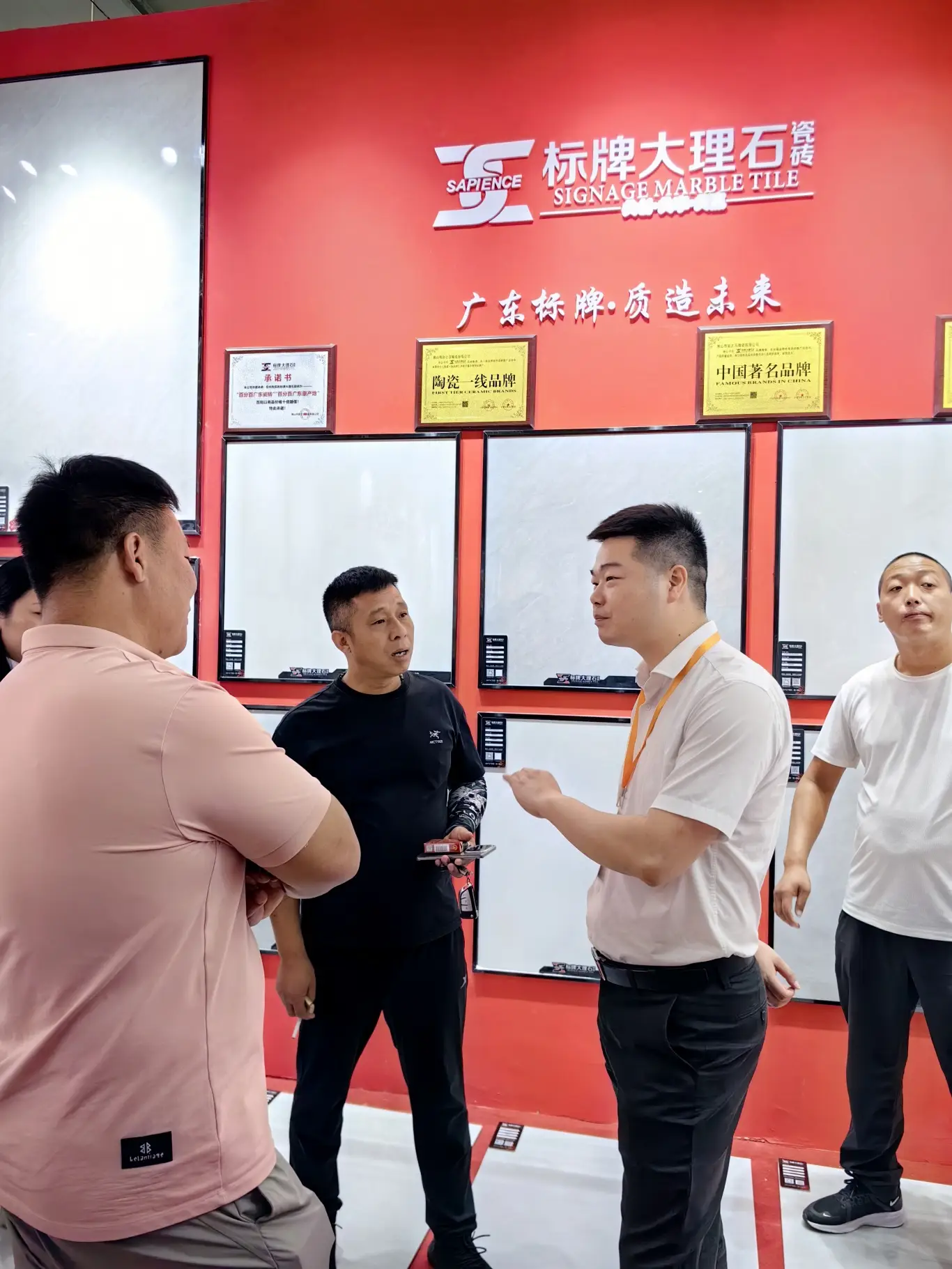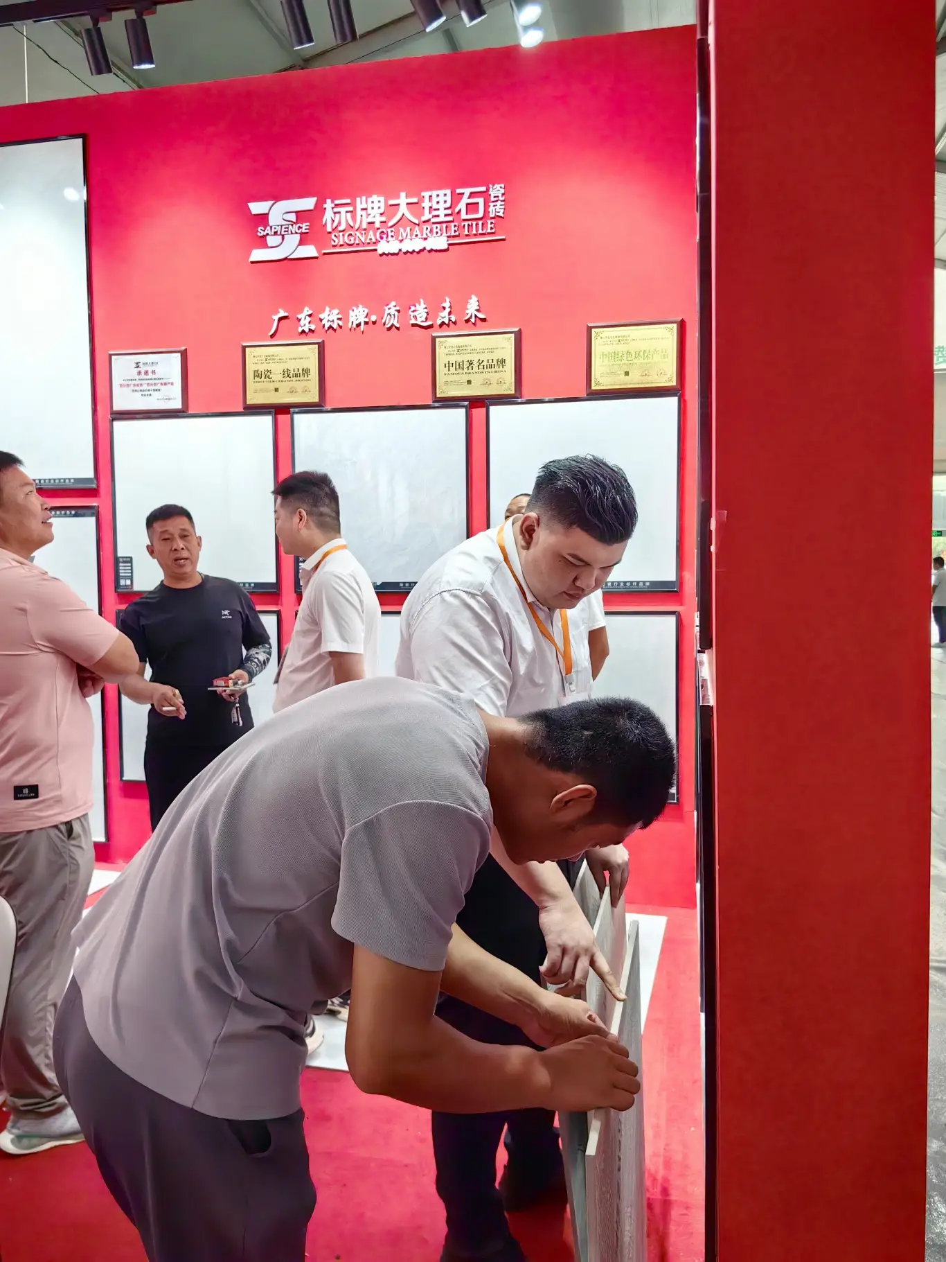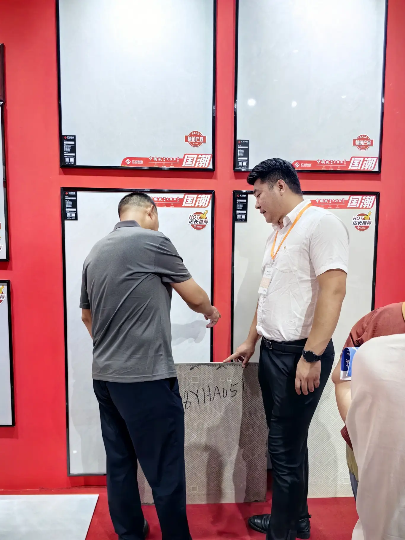 展会为期三天,汇远企业每天都是展会中最吸睛的展位。我们的展位以中国红为设计主色调,融入了中国风,佛山陶瓷,舞狮等多种岭南特色文化元素,同时为了现场突出品牌的独特性,还特意用800*800至尊白的新产品进行雕刻工艺,更大程度展示各自品牌文化,辉远品牌—昆仑山脉,新盟利—丝绸之路,标牌——繁花似锦等等。